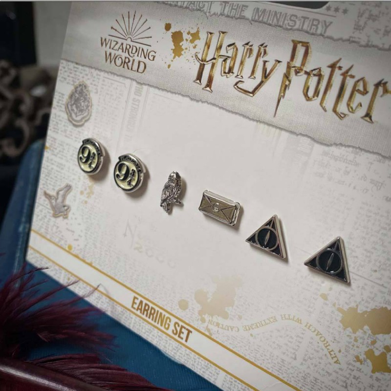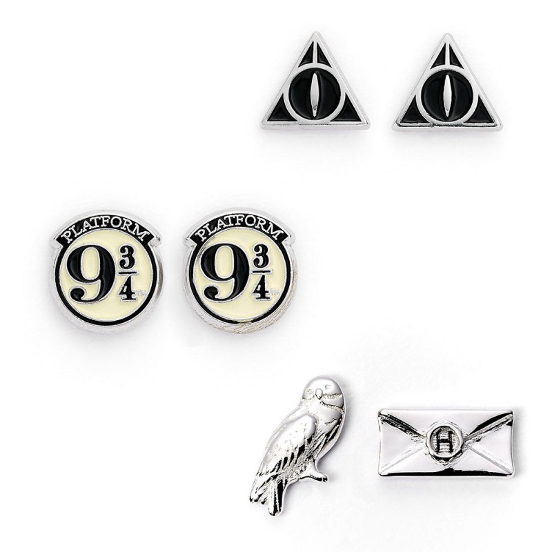 Boucles d'oreilles Harry Potter - Quai 9 3/4, Reliques de la Mort et Hedwige.Plongez dans l’univers magique de Poudlard avec ce superbe lot de boucles d’oreilles Harry Potter inspiré des symboles iconiques de la saga... Ce set comprend trois paires élégantes représentant le Quai 9 3/4, les Reliques de la Mort et la célèbre chouette Hedwige accompagnée de la lettre d’admission à l’école de sorcellerie...