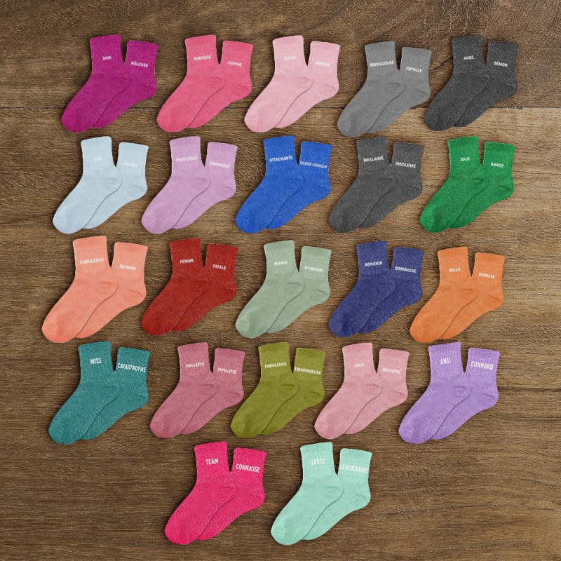 Ces chaussettes pailletées sont conçues pour celles qui aiment briller avec un brin d’audace et d’originalité. Disponibles en différents modèles au choix, elles affichent des inscriptions qui jouent sur la complicité et l’humour : "Princesse / Connasse", "Girl / Power", "Diva / Râleuse", "Attachante / Casse-Couille", "Bisou / Amour" et bien d’autres encore ! Chaque modèle arbore deux mots complémentaires, un sur chaque chaussette, créant un effet amusant et dynamique lorsque vous les portez. Leur finition scintillante ajoute une touche glamour, parfaite pour accessoiriser une tenue décontractée ou pour illuminer une soirée entre amis. Avec des couleurs variées allant du rose tendre au bleu électrique, chaque paire s’adapte à votre humeur et à votre style.