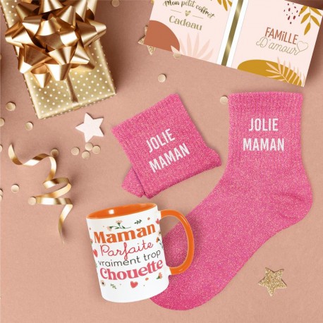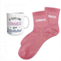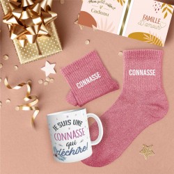 Un coffret plein de peps et d'humour pour offrir un moment cocooning tout en affirmant la personnalité de celle qui le reçoit ! Ce coffret mug et chaussettes paillettes fantaisie se compose d’une tasse en céramique colorée et d’une paire de chaussettes brillantes assorties, pour démarrer la journée avec style et bonne humeur... Trois modèles au choix vous permettent de personnaliser le message en fonction de la destinataire : “Jolie Maman”, “Super Mamie / Douce Mamie” ou la version culte “Connasse qui déchire”.