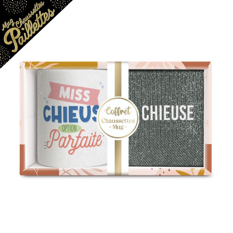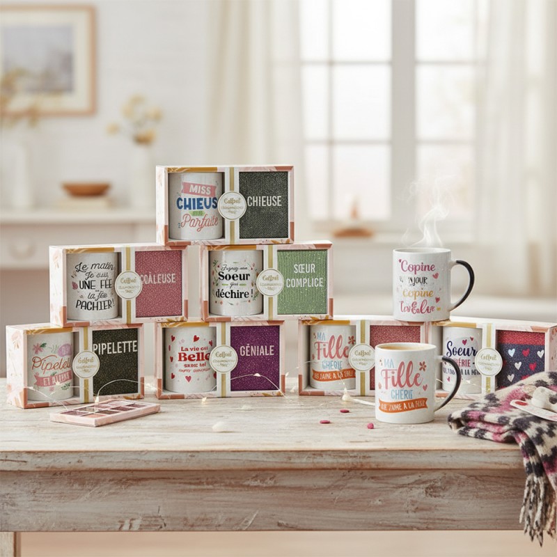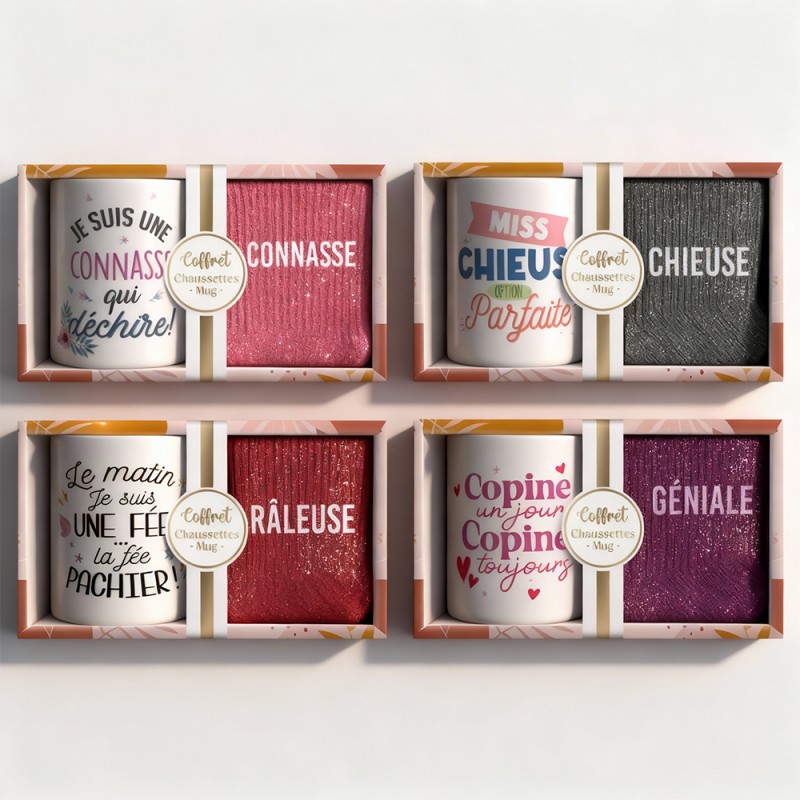 Des cadeaux à paillettes avec des messages pour toutes les personnalités.Le coffret cadeaux paillettes fantaisie est disponible en plusieurs modèles au choix, chacun pensé pour correspondre à un caractère bien précis. Que ce soit pour une femme de caractère, une proche adorée ou une personnalité haute en couleur, il y a forcément un message qui fera mouche... Ce coffret cadeau tasse & chaussettes a été pensé pour être à la fois utile et réconfortant. La tasse fantaisie accompagne les pauses café, thé ou chocolat chaud avec une touche d’humour et de tendresse, tandis que les chaussettes fantaisie apportent confort, chaleur et style au quotidien...
