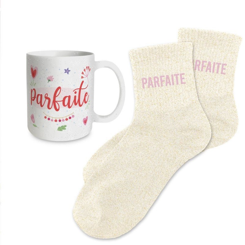 - Coffret avec mug coloré à paillettes en céramique et chaussettes paillettes assorties.