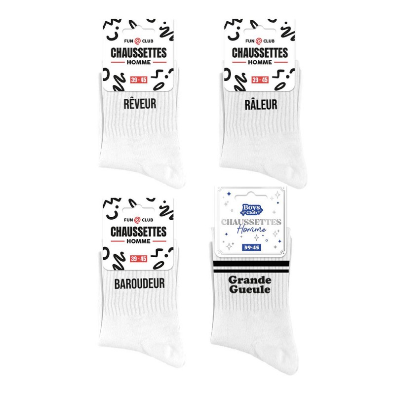 Ces chaussettes homme à message sont une valeur sûre pour faire le bonheur des hommes de vore vie, que ce soit à Noël, pour son anniversaire, la Fête des Pères ou un Secret Santa par exemple... Avec leurs messages décalés — Râleur, Baroudeur, Grande Gueule ou Rêveur — ces chaussettes amusantes pour homme sont le reflet parfait de l’humeur, du caractère ou de l’état d’esprit de celui qui les porte... Originales, utiles et pleines d'humour : impossible de se tromper avec ces chaussettes amusantes !