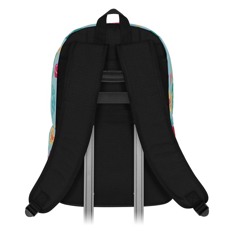 Ce sac à dos Stitch tropical guitare séduit autant par son design coloré que par sa praticité au quotidien. Ses dimensions généreuses de 44 x 31 x 18 cm permettent de transporter facilement cahiers, classeurs, affaires de sport ou ordinateur portable. La doublure intérieure rouge décorée de motifs floraux et tropicaux lui apporte une finition originale et résistante. Sa poche avant vous permet de garder vos essentiels à portée de main (clés, smartphone, stylos), tandis que son compartiment intérieur adapté aux appareils électroniques protège tablettes et ordinateurs. Grâce à ses fermetures Éclair robustes, il offre une sécurité optimale pour toutes vos affaires, tandis que ses sangles rembourrées garantissent un port agréable, même en cas de charge lourde