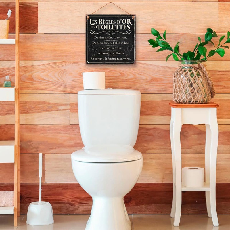 Apportez une touche d’humour et de style à vos toilettes.Ajoutez du caractère à vos WC avec cette plaque métallique « Les Règles d’Or des Toilettes », un accessoire de décoration aussi pratique qu’amusant... À la fois décorative et informative, cette plaque fantaisie rappelle avec humour les bonnes pratiques à adopter dans les toilettes, tout en embellissant l’espace !